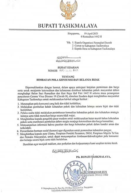 Surat edaran yang ditandatangani langsung oleh Plh Bupati Tasikmalaya, Dr. H. Mohamad Zen, juga bertujuan untuk menjamin ketersediaan dan kelancaran distribusi kebutuhan pokok masyarakat dalam menghadapi bulan suci Ramadhan dan Idul Fitri 1442H.