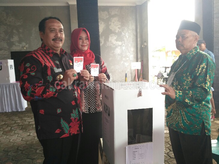Setelah memberikan suaranya, Bupati bersama istri lantas menunjukkan jari kelingking kiri yang sudah dicelupkan ke dalam tinta. Hal itu sebagai bukti jika telah melakukan pencoblosan dalam Pilgub Jabar ini.