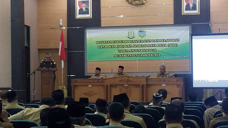 TASIKMALAYA (CM) – Evaluasi pemanfaatan dan pelaporan dana desa (DD) dan Alokasi Dana Desa (ADD) tahun Anggaran Tahun 2018 se-Kabupaten Tasikmalaya berlangsung di Pendopo Baru Jl. Sukapura II Bojongkoneng Kab. Tasikmalaya, Selasa (09/04/2019) pagi.