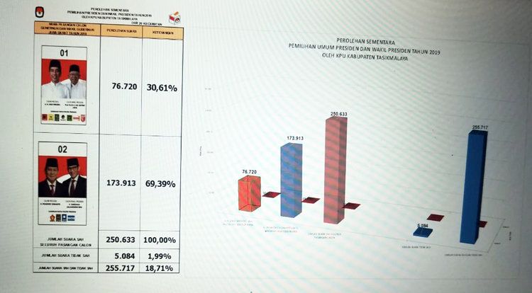 TASIKMALAYA (CM) – Hasil sementara perolehan suara sementara Calon Presiden dan Wakil Presiden tahun 2019, untuk Kabupaten Tasikmalaya, Rabu (17/042019) malam, menunjukan Paslon Nomor urut 02, Prabowo-Sandi unggul dengan perolehan suara sebanyak 173.913 atau 69.39%. Sementara, Paslon Nomor Urut 01 Jokowi-Ma’aruf Amin 76.720 suara atau 30.61%