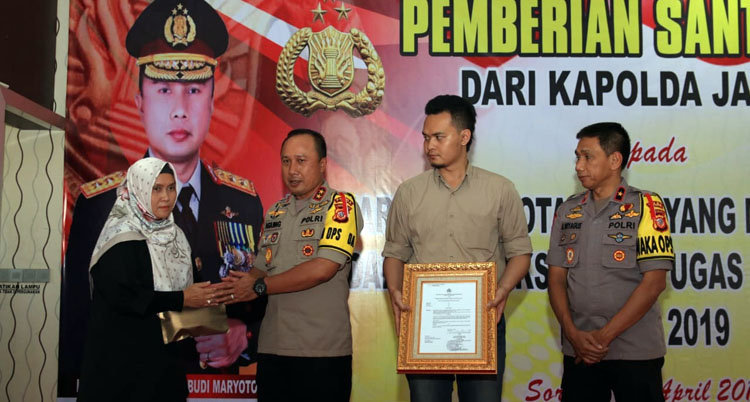 Selain memberikan santunan kepada keluarga korban, Kapolda Jabar juga memberikan penghargaan pangkat setingkat lebih tinggi berdasarkan Keputusan Kapolri Nomor : Kep/185/IV/2019. (Intan)