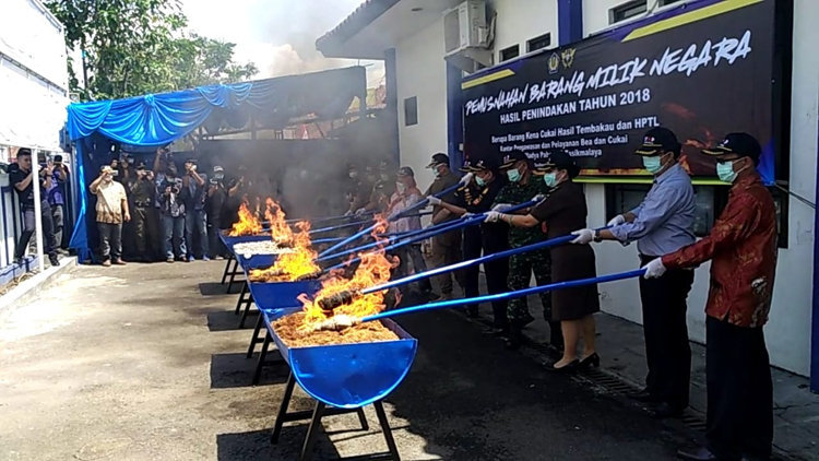 Kabid P2 DJBC Kanwil Bea dan Cukai Jawa Barat, Bier Budi Kismulyanto mengungkapkan pemusnahan barang milik negara hasil penindakan di tahun 2018 hasil produksi rokok secara langsung.