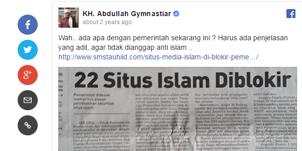 Aa Gym protes. “Wah, ada apa dengan pemerintah sekarang ini? Harus ada penjelasan yang adil agar tidak dianggap anti-Islam,” tulis Aa Gym dalam Facebooknya, saat itu. (pey)