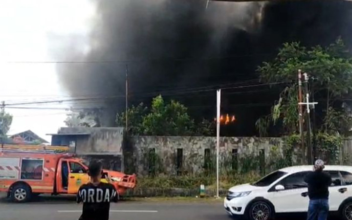 Kobaran api disertai asap pekat terlihat menjulang tinggi dari bangunan berukuran 28 x 17 meter yang sudah tiga tahun kosong. Gudang tersebut belakangan dipakai untuk menyimpan barang-barang rongsokan.