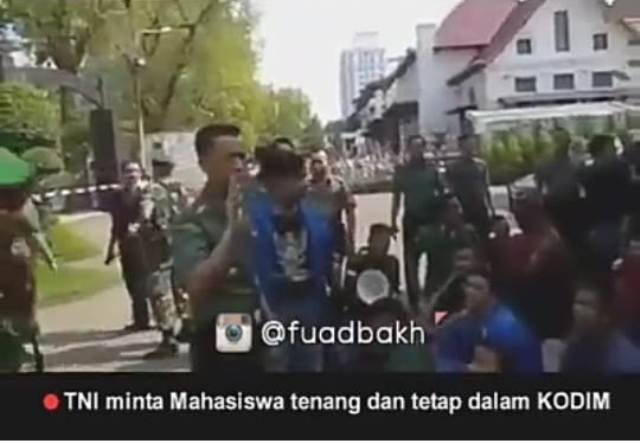 Kedatangan puluhan mahasiswa ke markas Kodim itu mengundang perhatian personel TNI yang berada di dalam Makodim, dan langsung berhamburan keluar untuk melihat apa yang terjadi. sejumlah anggota TNI yang tengah berpiket dan proovost langsung menghampiri puluhan polisi yang tak sabar ingin mengejar mahasiswa kedalam markas tentara ini,  “ Sudah mereka sudah ada di markas kami, kami yang tanggung jawab ” ucap anggota TNI melalui pengeras suara.