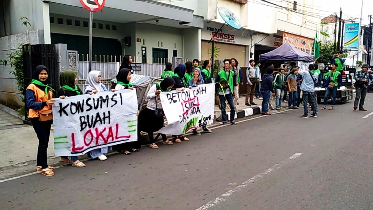 Dalam aksinya, para mahasiswa membentangkan sejumlah sepanduk yang berisikan, “Beton lebih subur daripada buah, save buah, konsumsi buah lokal”.