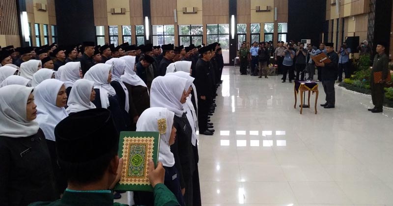 KOTA TASIKMALAYA (CM) – Wali Kota Tasikmalaya, Budi Budiman, melantik dan mengambil sumpah 337 Pejabat Pimpinan Tinggi Pratama, Administrator, Pengawas dan Pejabat Fungsional, serta Kepala Sekolah di Gedung Serbaguna Bale Kota Tasikmalaya, Jumat (17/07/2018).