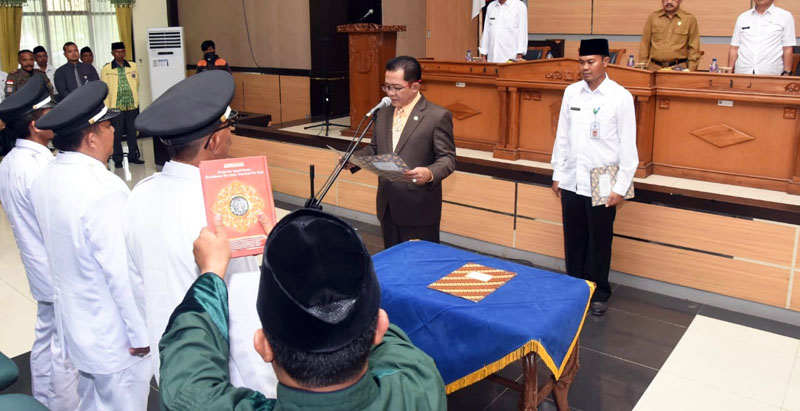 TASIKMALAYA (CM) – Wakil Bupati Tasikmalaya, Ade Sugianto, mengambil seumpah dan melantik dua pejabat kepala desa dan satu kepala desa penganti antar waktu, di Pendopo Baru, Bojong Koneng, Kabupaten Tasikmalaya, Rabu (17/10/2018). Pelantikan dihadiri banyak unsur mulai dari Kepala SKPD, Ketua DPRD dan sejumlah pejabat lainnya.
